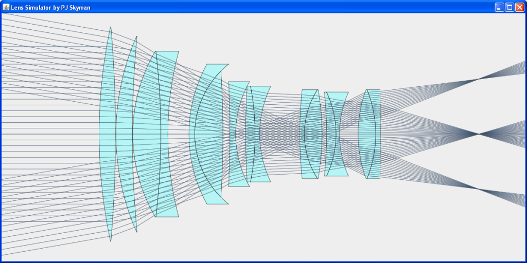 Il y a quelques mois, je me suis lancé dans le développement d’un outil de simulation d’objectifs. Le projet a longtemps dormi. Puis, très récemment, j’ai repris le développement de ce logiciel de simulation en implémentant des formules de réfraction de rayons. Le traçage de rayons est maintenant opérationnel pour les lentilles sphériques et le sera bientôt pour les lentilles asphériques.